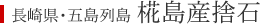 五島列島・福江島の北東16km(海上タクシーで約20分)の海上に位置する椛島は、海岸線までヤマが迫っており、運搬船の出入りに便利な入り江に桟橋を2基有し、スピーディな積込作業を可能にしています。